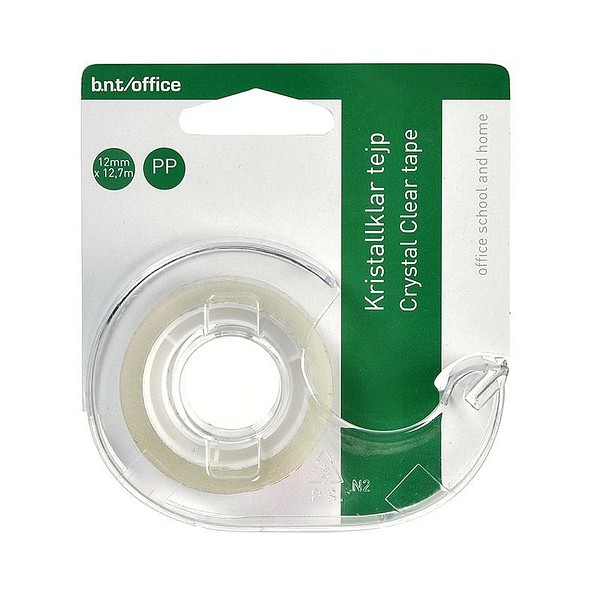 BNT Crystal teippi, 12,7 mm x 12 m. Kirkas ja vahva teippi monipuoliseen käyttöön toimistossa ja kotona. Erinomainen tarttuvuus ja helppo käyttää.