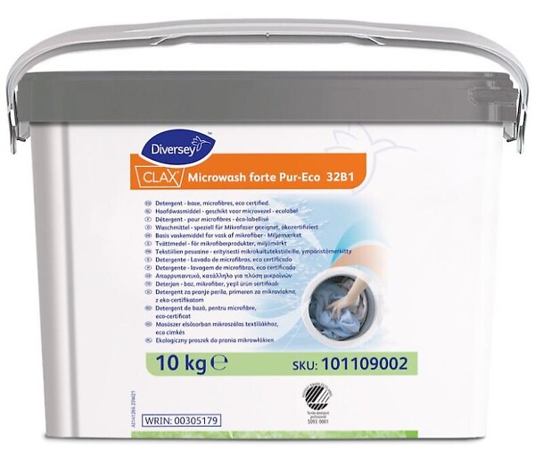 Clax Microwash forte Pur-Eco pesee tehokkaasti mikrokuitutekstiilit, kuten siivouspyyhkeet ja mopit, ja säilyttää mikrokuidun rakenteen. Mikrokuitujen erinomaiset ominaisuudet säilyvät näin pesujen jälkeen muuttumattomina ja siivoustekstiilit säilyttävät puhdistustehonsa. Clax Microwash forte Pur-Eco:n raaka-aineet on valittu mikrokuituvalmistajien suositusten mukaisesti. Clax Microwash forte Pur-Eco soveltuu myös kaikkien muiden värillisten tekstiilien pesuun, koska siinä ei ole valkaisuainetta. Ei suositella kuitenkaan villalle tai silkille. Clax Microwash forte Pur-Eco on entsyymipitoinen pesujauhe, jonka raaka-aineita ovat entsyymit, tehokkaat pinta-aktiiviset aineet, vedenpehmentimet, harmaantumisen estoaineet sekä korroosionsuoja-aine