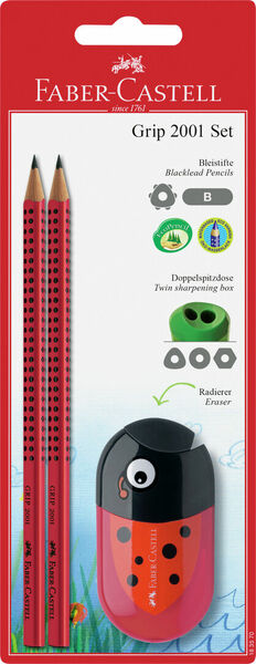 Faber-Castellin blisterikortilla on trendikuosikumi, kaksi Grip lyijykynää ja teroitin. Kaikki tuotteet ovat korkealuokkaisia Faber-Castell -tuotteita ja kuuluvat Grip -tuoteperheeseen.