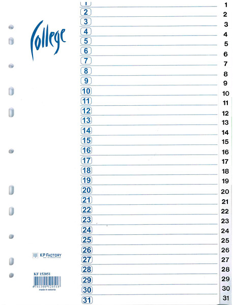 Hakemisto 1-31 kartonkia A4 on käytännöllinen ja kestävä ratkaisu kaikenlaisten A4-kokoisten asiakirjojen järjestämiseen ja arkistointiin. Tämä tuote sisältää 35 sarjaa valkoisia, selkeästi numeroituja välilehtiä, jotka helpottavat dokumenttien nopeaa löytämistä ja käyttöä. Numerointi 1-31 mahdollistaa päivittäisen tai kuukausittaisen järjestelyn, mikä tekee siitä ihanteellisen toimistoihin, kouluihin ja kotikonttoreihin. Välilehdet on valmistettu kestävästä kartongista, joka kestää pitkään käytössä. Pakkaus sisältää yhteensä 35 sarjaa, joten yksi ostos riittää suuremmankin arkiston tarpeisiin. Hakemiston käyttö on helppoa ja se sopii kaikkiin standardikokoisiin kansioihin ja arkistointijärjestelmiin.