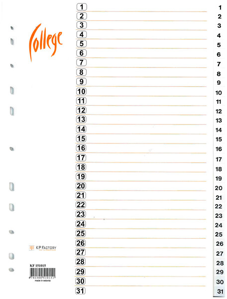 Hakemisto A4 1-31 on suunniteltu tehokkaaseen paperidokumenttien hallintaan. Valmistettu kestävästä muovista ja laadukkaasta kartongista, tämä hakemisto kestää aktiivista käyttöä. Siinä on 31 selkeästi numeroitua välilehteä, jotka helpottavat asiakirjojen järjestämistä päivämäärän tai tärkeysjärjestyksen mukaan. Välilehdet mahdollistavat nopean pääsyn tarvittaviin dokumentteihin, mikä säästää aikaa ja parantaa tehokkuutta. Tämä hakemisto on erinomainen valinta niin toimistoihin, kouluihin kuin kotikonttoreihinkin, tarjoten selkeän ja järjestelmällisen tavan säilyttää tärkeät paperit järjestyksessä ja helposti saatavilla.