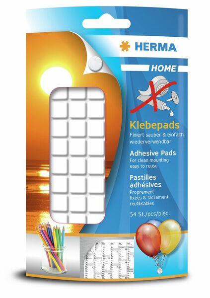 Herma tarratyynyt tahraamaton valkoinen kiinnitystahna. Valkotarra voidaan poistaa jälkiä jättämättä ja se voidaan käyttää uudelleen. Levyyn on valmiiksi stanssattu 54 palaa. Yksittäisen palan koko n. 11x11mm.