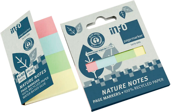 Info Notes Nature teippimerkit ovat käytännöllinen ja värikäs lisä toimistoon tai kotiin. Koko 20x50mm teippilaput tulevat neljässä eri värissä, mikä tekee niistä ihanteellisen valinnan erilaisten asioiden merkitsemiseen ja muistutusten jättämiseen. Pakkaus sisältää yhteensä 160 teippilappua, joten ne kestävät pitkään, vaikka käyttö olisi päivittäistä. Teippimerkit tarttuvat hyvin erilaisille pinnoille ja niitä on helppo siirtää tarvittaessa. Ne ovat myös ympäristöystävällinen valinta, sillä ne on valmistettu kierrätettävistä materiaaleista. Tämä tuote on erinomainen apuväline järjestämään työpäivääsi ja pitämään tärkeät asiat muistissa.