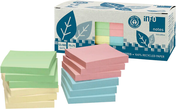 Info Notes eko viestilaput ovat ympäristöystävällinen valinta toimistoon. Koko 75×75 mm, pakkaus sisältää värikkään lajitelman, joka piristää päivittäistä muistiinpanojen tekoa. Jokainen pakkaus sisältää 12 lehtiötä, joissa kussakin on 100 lappua, yhteensä 1200 lappua. Nämä itsekiinnittyvät muistilaput ovat käteviä muistutuksia, viestejä ja tehtävälistoja varten. Ne tarttuvat helposti erilaisiin pintoihin ja irtoavat jälkiä jättämättä. Valmistettu ympäristöä säästäen, ne ovat erinomainen valinta ekotietoiselle kuluttajalle.