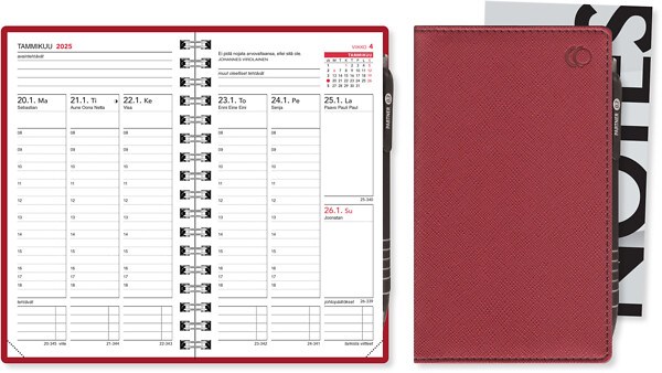 Hyödyllinen ja suosittu Leader-taskukalenteri on ihanteellinen työkalu ajanhallintaan ja tehtävien organisointiin. Kalenterissa on selkeä viitejärjestelmä, joka yhdistettynä runsaaseen sisältöön ja laajoihin muistiinpanomahdollisuuksiin tekee siitä erinomaisen valinnan niin projekteihin kuin kokouksiinkin. Erilliset tehtäväluettelot ja selkeästi jaoteltu kalenteriosa sijaitsevat kestävissä ja tyylikkäissä keinonahkakansissa, jotka tarjoavat myös säilytystilaa kuiteille ja muille tärkeille papereille. Kalenteri sisältää viikoittaiset näkymät tunneittain (8-18), liputuspäivät, kansalliset pyhät sekä nimipäivät. Lisäksi mukana on kuukausi- ja projektisuunnittelusivut vuosille 2025 ja 2026. Koko 87 x 153 mm, kattaa viikot 42/2024-1/2026. Wiresidottu ja kulmaperforoitu muotoilu sekä pehmustettu, sisävuorattu keinonahkakansi lisäävät käyttömukavuutta. Leader-kalenteri on tunnettu myös arjen aforismeistaan, jotka tarjoavat inspiraatiota päivittäiseen käyttöön.