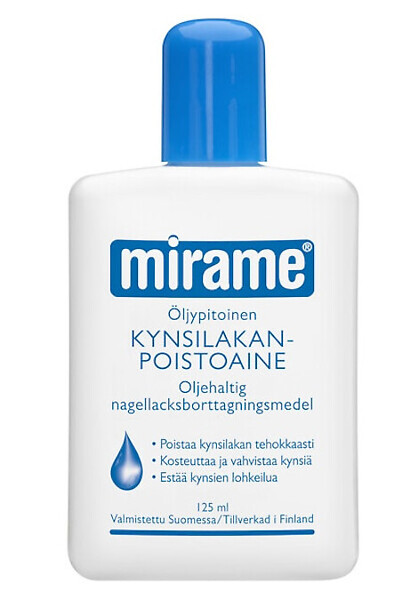 Mirame kynsilakanpoistoaine on suunniteltu erityisesti kynsien hellävaraiseen ja tehokkaaseen puhdistukseen. Tämä 125 ml:n pakkaus sisältää öljypitoisen koostumuksen, joka ei ainoastaan poista kynsilakkaa tehokkaasti, vaan myös hoitaa ja suojaa kynsiäsi poiston aikana. Tuote on kehitetty vahvistamaan kynsien luonnollista rakennetta ja estämään niiden kuivumista. Käyttö on vaivatonta: liota vanulappu poistoaineeseen, pyyhi kynnet puhtaiksi ja nauti terveistä, kauniista kynsistä ilman ylimääräistä rasitusta. Mirame kynsilakanpoistoaine on taloudellinen valinta, sillä pienikin määrä tuotetta riittää tehokkaaseen puhdistukseen. Kokeile ja huomaa ero!