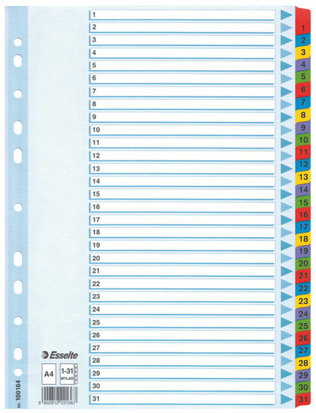 Esselten Mylar-hakemisto on suunniteltu kestävyyttä ja käytännöllisyyttä silmällä pitäen. Tämä A4-kokoinen hakemisto on valmistettu vahvasta materiaalista, ja sen kirkkaat väriyhdistelmät tekevät siitä sekä visuaalisesti houkuttelevan että helposti lähestyttävän. Hakemistossa on 31 muovista, kestävää kielekettä, jotka on numeroitu molemmin puolin, mikä helpottaa asiakirjojen nopeaa löytämistä ja järjestämistä. Etusivu tarjoaa runsaasti tilaa sisällön tarkalle kuvaukselle, mikä tekee dokumenttien hallinnasta tehokkaampaa. Tämä monikäyttöinen hakemisto on ihanteellinen valinta niin toimistoon kuin kotiinkin, tarjoten luotettavan ratkaisun paperidokumenttien säilytykseen ja arkistointiin.