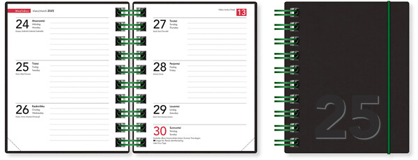 Ontime Mini eko2025 on käytännöllinen ja ympäristötietoinen valinta jokapäiväiseen suunnitteluun. Tämä kompakti taskukalenteri, kooltaan 120 x 150 mm, kattaa ajanjakson viikosta 49/2024 aina viikkoon 1/2026. Kalenterissa on vuosisuunnitelmat vuosille 2025 ja 2026, mikä tekee pitkän tähtäimen suunnittelusta vaivatonta. Jokaisella aukeamalla on yksi viikko, tarjoten runsaasti tilaa päiväkohtaisille muistiinpanoille. Selkeät ja suuret kalenteriaukeamat tekevät päivittäisestä suunnittelusta ja muistiinpanojen kirjaamisesta helppoa. Kalenteri on wiresidottu ja siinä on kulmaperforointi, joka helpottaa sivujen kääntämistä ja merkintöjen tekemistä. Tukevat mustat kierrätyskartonkikannet lisäävät tuotteen kestävyyttä ja ympäristöystävällisyyttä. Kolmikielinen kieliasu (suomi, ruotsi, englanti) tekee kalenterista monipuolisen työkalun eri kielialueilla toimiville käyttäjille. Painettu FSC-sertifioidulle paperille, tämä kalenteri on sekä käytännöllinen että ekologinen valinta.