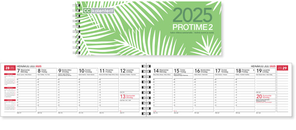 Protime 2 eko pöytäkalenteri on ihanteellinen työkalu tehokkaaseen ajankäyttöön toimistossa tai kotona. Kalenteri kattaa viikot 50/2024-1/2026, sisältäen vuosisuunnittelut vuosille 2025 ja 2026 sekä vuosikalenterit vuosille 2026-2029. Jokaisella aukeamalla on kaksi viikkoa, ja päivittäiset tunnit on merkitty kello 8-18. Kalenteri huomioi myös liputuspäivät, kansalliset pyhäpäivät sekä nimipäivät, jotka on esitetty sekä aukeamilla että luettelona. Lisäksi mukana on käteviä muistiinpanosivuja. Kalenterin kannet ovat kestävää kartonkia ja se on wiresidottu, mikä tekee sivujen kääntämisestä sujuvaa. Kieliasu on suomi ja ruotsi, ja se on painettu ympäristöystävälliselle FSC-sertifioidulle paperille, mikä tekee siitä ekologisen valinnan.