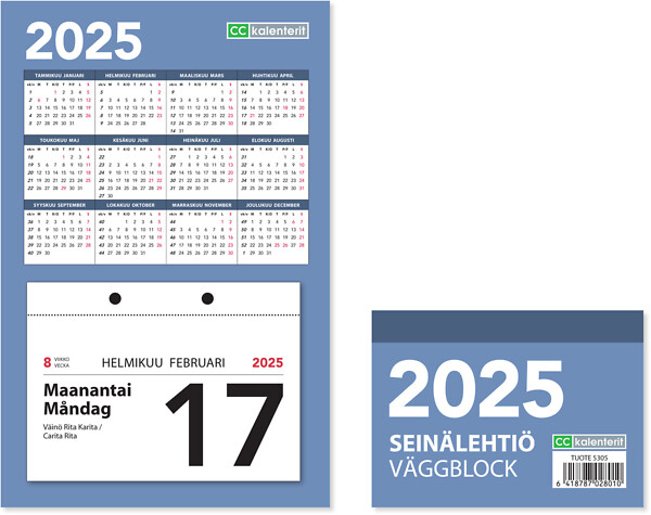 CC KALENTE seinälehtiökalenteri 2025 on suunniteltu tehokkaaseen ja käytännölliseen päivittäiseen käyttöön. Jokainen päivä on omalla, sivusuunnassa helposti irrotettavalla lehdellään, mikä mahdollistaa nopean pääsyn haluttuun päivämäärään. Kalenteri on kiinnitetty tukevaan, pahvisen ripustustaustaan metallikiinnikkeillä, joka takaa kestävyyden koko vuoden ajaksi. Ripustustaustassa on lisäksi koko vuoden päivämäärät taulukkomuodossa, joten voit helposti tarkastella koko vuoden suunnitelmia yhdellä silmäyksellä. Kalenterissa on päiväkohtaista muistiinpanotilaa, joten voit kirjata tärkeät muistiinpanot ja tapahtumat suoraan kalenteriin. Kieliasu on suomi ja ruotsi, mikä tekee siitä sopivan käytettäväksi kaksikielisissä ympäristöissä. Kalenterin mitat ovat korkeus 200 mm, leveys 130 mm ja syvyys 30 mm. Se on painettu ympäristöystävälliselle FSC-sertifioidulle paperille, mikä vahvistaa yrityksen sitoutumista kestävään kehitykseen.