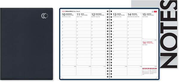 Kalenteri on A5-kokoinen, viikot 48/2024-1/2026, vuosisuunnittelu 2025 ja vuosi 2026 laajana, aukeamalla viikko, tunnit 8-19. Yleiskalendaario, liputuspäivät, kansalliset pyhät ja nimipäivät aukeamilla sekä myös luettelona. Infosivuja, tehtäväruudukko, tehtäväluettelot, syntymäpäivä- ja lahjasivu sekä vuosikalenterit 2026-2029. Aukeamilla kahden kuukauden seuranta, runsaasti päiväkohtaista muistiinpanotilaa. Wiresidottu, kulmaperforoitu. Siirrettävä Notes-muistio. Tukevat siniset kannet kestävät myös monivuotista käyttöä. Kieliasu suomi, ruotsi ja englanti. Painettu FSC-sertifioidulle paperille.